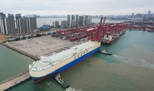 滾裝貨船“勞拉”輪駛?cè)牒?谛阌⒏郏@是海南自貿(mào)區(qū)政策實(shí)施以來(lái)的首艘汽車外貿(mào)船(2月16日攝,無(wú)人機(jī)照片)。新華社記者 楊冠宇 攝
